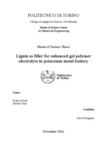 Sfide dell'ingegneria dei materiali nel campo delle batterieTra i 17 obiettivi dell’Agenda 2030 per lo sviluppo sostenibile, diversi comportano la necessità di attuare una transizione energetica in termini di ottimizzazione dei consumi e passaggio da fonti energetiche fossili a fonti rinnovabili. I sistemi di accumulo di energia sono l’unica soluzione attuabile per incrementare l’utilizzo di fonti rinnovabili, in quanto permettono di compensarne l’intrinseca intermittenza e sfruttare un’eventuale sovrapproduzione. Tra le varie tecnologie di accumulo energetico, quello elettrochimico risulta essere il più versatile; in particolare negli ultimi anni le batterie al litio hanno riscontrato grande successo. Tuttavia, non è possibile soddisfare il fabbisogno energetico usando unicamente i sistemi al litio data la criticità nell’approvvigionamento delle materie prime necessarie. Le batterie al potassio si prospettano una valida alternativa a quelle al litio nei settori dove non è richiesta un’elevata densità di energia gravimetrica. Questo lavoro di tesi si occupa della caratterizzazione di membrane gel polimeriche a base di PCLDMA, PEG e UPy-MA rinforzate con diverse percentuali di lignina (0, 3, 5, 7, 10 e 20% in peso riferito alla massa di PCLDMA). Lo swelling della matrice polimerica è stato effettuato in una soluzione 1 M di KFSI in EC/DEC 1:1. Dall’analisi termogravimetrica si è osservato che le membrane degradano a temperature maggiori di ≈ 250 °C. La calorimetria a scansione differenziale ha mostrato che all’aumentare del contenuto di lignina si ha un aumento della temperatura di transizione vetrosa e della fase amorfa all’interno del polimero, quest’ultimo evidenziato dalla diminuzione di entalpia di fusione. Attraverso la voltammetria a scansione lineare si è constatato che non si verifichino importanti reazioni tra membrana, elettrolita e potassio metallico in un intervallo di potenziale compreso tra 0.01 V e 3 V. La presenza di lignina all’interno della matrice polimerica ha mostrato un notevole aumento della conducibilità ionica, ma non vi è un trend specifico in funzione del contenuto di lignina. Le membrane hanno inoltre mostrato numeri di trasporto compresi tra 0.53 e 0.59; in particolare i valori più alti sono stati ottenuti per le membrane con minor contenuto di lignina. È stato in aggiunta effettuato il test di plating e stripping, dal quale è emerso che tutte le membrane dimostrano di sopprimere la crescita di dendriti per correnti pari a 0.1 mA/cm2; tuttavia per correnti maggiori, pari a 0.5 mA/cm2, non tutte le membrane hanno mostrato buona abilità ad inibire la nucleazione di dendriti. Sono state infine effettuate prove di ciclaggio galvanostatico su semi-celle con anodo in potassio metallico e catodo in C65. Queste hanno mostrato promettenti capacità specifiche di carica e scarica e una buona stabilità in funzione del numero di cicli; in particolare i migliori risultati sono stati ottenuti con la membrana contenente il 5% di lignina. Tale membrana è stata dunque sottoposta a una prova di self-healing che ha mostrato risultati positivi. |