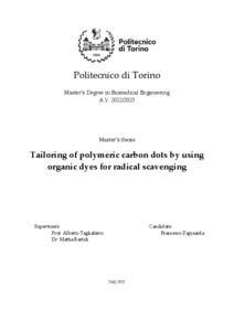 Carbon dots (CDs) are emerging as versatile fluorescent nanomaterials due to their excellent properties such as high-water solubility, photostability, good biocompatibility, flexibility for surface modification, low toxicity and production costs. These characteristics make them preferable to their inorganic cousins Quantum Dots (QDs) and more suitable for biomedical applications, such as imaging, antibacterial therapy, drug delivery for cancer treatment, photodynamic therapy and antioxidative nanotechnology. Regarding the last field, CDs have proven to possess scavenging activity towards reactive oxygen species (ROS), which are chemical, highly reactive, oxygen-containing species including hydroxyl radical , singlet oxygen, superoxide anion, and hydrogen peroxide. This antioxidant capability allows CDs to act as effective agents capable of keeping the concentration of ROS low, preventing various diseases such as cancer, atherosclerosis, neurological disorders, asthma, hypertensions, local anaphylaxis or inflammation. In this thesis work, three different types of CDs were synthetized by ultrasonic-assisted method using Citric Acid (CA) and p-Phenylendiamine (DPA) as precursors. First of all, pristine CDs with only CA and DPA as reagents were synthesized. Then, two organic dyes, Methylene Blue (MB) and Cochineal Red (CR) were added keeping the other two precursors and the synthesis method unchanged, in order to create more performant CDs (second and third type respectively) for what concern scavenging activity and red-shifted fluorescence emission, resulting in less energy been released and making them hopefully more suitable for biomedical field. All CDs were characterized through different spectroscopic techniques in order to investigate structural and photophysical properties of the three types of CDs obtained. Lastly, solutions of CDs and another organic dye (Curcumin) were prepared in order to investigate and evaluate CDs scavenging activity. |