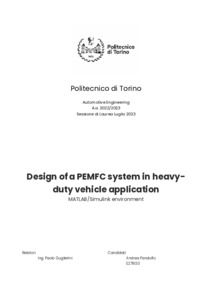 During the last two decades the interest towards alternative solutions for the propulsion system of automotive vehicles has increasingly grown, in order to face the several environmental problems and the consequent increasingly stringent European regulation. One of the solutions that has been proposed and has risen the biggest scientific interest is the usage of hydrogen fuel cell (more precisely polymeric electrolyte membrane fuel cell, PEMFC). This solution has several advantages: PMEFCs are able to convert the chemical energy of the hydrogen into electrical energy exploiting the reverse principle of electrolysis, producing only water and heat, hence without pollutant emissions; PEMFCs can operate as long as there is hydrogen available in the tank, thus the fuel cell electric vehicles have less autonomy issues than battery electric vehicles; Hydrogen tank can be refilled in few minutes, unlike the battery electric vehicle that takes a lot of time to recharge the batteries. The aim of this master thesis is to develop and design the thermal management system of a heavy-duty vehicle powered by a hydrogen fuel cell in order to minimize the energy cost. Firstly, a general overview of the fuel cell will be presented. Then, the model of the PMFC and its thermal management system will be designed and performed using MATLAB-Simulink. The system will be optimized to minimize the energy required by the auxiliaries and, consequently, the fuel consumption. Generally, the efficiency of a PEMFC is about 0.6. The projected outcome is to increase the efficiency of the system exploiting the heat loss of the fuel cell obtaining a general efficiency of the system of about 0.8. The PEMFC technology has promising characteristics suitable for the automotive field. Thanks to a proper water management and a thermal management system it may become the best solution for the transportation field. However, the production of the components needed is very niche and then its costs are higher than the technologies currently used. In addition, the supply network for hydrogen fuel is still too narrow and should be improved. In conclusion, the PEMFC chemical potential and the easily and fast refillable nature of the hydrogen storage system, provided the efficiency of the system is risen and the knowledge on calculations to reach It is deepened, could constitute a greener and cheaper solution for heavy-duty vehicles’ sector. |