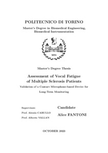 Multiple Sclerosis (MS) is a neuro-degenerative disease of the central nervous system, involving motor symptoms such as spasticity, weakness, language disorders and dysphonia; also, fatigue is often considered one of the most debilitating symptoms of MS. An acoustic analysis of MS is performed with vocal material supplied by the speech department of Don Gnocchi hospital (Milan). The data-set includes voice recordings of two subgroups of identical dimension (i.e., sixteen subjects) correspondent to healthy subjects (HS) and MS. Speech material consists in the vocalization of the sustained vowel /a/, the reading of a phonetically balanced speech (Notturno) and one minute of free speech for each subject. Additionally, long-term recordings are carried out with VH device only, covering a maximum period of four hours. About signals acquired with in-air microphone, pre-processing and harmonic frame selection phases are executed in Matlab (R2022b) environment and then, the extraction of parameters is operated. Using a Logistic Regression (LR) model, data are classified dividing them into two classes (HS and MS). The LR model is trained using a single and a combination of 2, 3, 4 features; the combinations exhibiting the best performance in terms of accuracy and Area Under The Curve (AUC) are selected; then, for these, 5-fold cross-validation is implemented. Best performances are obtained for the reading task (accuracy equal to 92.3%) by selecting 3 features, which are gender, 5° percentile of Cepstral Peak Prominence Smoothed, and harmonic frames ratio V/uV. The expanded uncertainty U(p) is evaluated, providing a confidence interval; when the confidence interval includes the discrimination probability, the classification of the subject is considered "non-classifiable" and new classification metrics are defined, such as Realistic Accuracy and Fraction of Classified (FoC). The implementation of this procedure to combination showing best performances (gender, CPPS (5,prc) and V/uV), results in FoC of 92.3% and higher accuracy. To validate VH device, parameters from the microphone in air are compared to ones from VH by calculating differences Δ between these measures. Considering sustained vowel /a/ task, the analysis is performed on parameters local jitter (%), local shimmer (%), CPPS (median) (dB) and CPPS (std) (dB); for balanced and free speech task differences are carried out for fundamental frequency f0 (Hz) and CPPS (dB). For local jitter, CPPS (median) and CPPS (std) the validation can be considered passed, while for others, such as local shimmer, significant differences are noted. Since the two devices have different characteristics they receive as input different signals, the use of VH device requires the definition of specific cut-off values for the extracted parameters. A proposal to assess fatigue is conducted using differences δ between parameters extracted from long-term and short-term monitoring; this comparison is performed considering the parameters fundamental frequency f0, CPPS (dB), Background Noise Level (90° percentile) in dBA and Sound Pressure Level (dB). No significant difference with regard to the fatigue is found; however, limitations can be overcome through both an increase in the data-set and in the time interval of the records, being acquisitions too short to demonstrate fatigue. Eventually, an evaluation of five vocal dose measures as indicators of long-term vocal folds tissue exposure to vibration is provided.