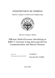 This thesis investigates the interfacing of two RISC-V processors using interrupt handlers to provide efficient communication and data transfer. The study focuses on developing a method that uses interrupt-driven systems to optimize performance, particularly for IoT applications that require energy efficiency while providing relatively high performance. The thesis begins with an in-depth examination of the RISC-V architecture, including a detailed discussion of the RV32I subset, and progresses to the development of an interfacing methodology that employs shared memory and synchronization mechanisms. It then shows how a primary low-power RISC-V processor can communicate with a secondary high-power accelerator processor using interrupt signals to manage data transfer through shared memory. The provided SystemVerilog and C code demonstrate the implementation of this methodology, highlighting the roles of interrupt handlers and memory management techniques. Experimental validation was conducted entirely in a software simulation environment, employing tools such as the Xcelium Logic Simulator. Tests focused on verifying interrupt handling, data transfer accuracy, synchronization, and overall performance metrics. The experimentation, while preliminary, indicated the feasibility and efficiency of the proposed system, demonstrating the potential for reliable communication and high-performance data exchange between the processors. Key contributions of this thesis include a robust framework for multi-processor interfacing using interrupt-driven communication and shared memory, along with practical insights into memory utilization and data synchronization. The research findings suggest a lot of potential for enhancing the performance and scalability of RISC-V based systems, particularly in resource-constrained environments. Future work could extend these findings through hardware-based implementations and explore asynchronous processing techniques to further reduce power consumption and improve system responsiveness. This thesis lays a solid foundation for advancing the design and implementation of efficient multi-processor systems in various application domains. |
