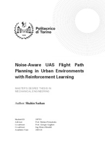 This thesis presents a comprehensive approach to mitigating noise pollution from Unmanned Aerial Systems (UAS) in urban environments through flight path planning using reinforcement learning (RL). The study focuses on Turin, Italy, leveraging its diverse urban architecture to develop a comprehensive model. A detailed 3D occupancy grid map, based on OpenStreetMap data, was created to represent buildings' locations and heights while a population density map was developed to account for demographic variances. The research develops a dynamic noise source model that adjusts noise emission levels based on UAV velocity, ensuring realistic noise impact predictions. Acoustic ray tracing techniques are utilized to simulate noise propagation, accounting for atmospheric absorption and reflections from urban structures, providing a detailed analysis of noise distribution. The core of this work is the application of the Deep Deterministic Policy Gradient (DDPG) algorithm within the RL framework. The algorithm is tailored to optimize flight paths by minimizing noise impact while balancing other factors like travel distance and energy efficiency. The RL agent learns to navigate complex urban landscapes, integrating penalties for idling, excessive distance, and abrupt maneuvers to refine its path planning strategy. Key findings reveal that the RL-based approach effectively reduces noise impact in urban settings, making it a viable solution for integrating UAVs into urban air mobility systems. The methodology is scalable and adaptable, with potential applications in various urban environments globally. This research contributes to the development of sustainable urban air mobility by addressing the critical issue of noise pollution, enhancing public acceptance and regulatory compliance. |