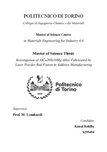 The production of metal components by Additive Manufacturing (AM) processes has been experiencing exponential growth in recent years. However, only a limited number of alloys can be processed through metal AM. To address this limitation, this thesis investigates optimization of process parameters in Laser Powder Bed Fusion (LPBF) – AM for an AlSi10Mg alloy with 20% wt. (Cu) aiming to significantly reduce defects such as porosity and cracks. LPBF parameters including laser power, scanning speed, and layer thickness were taken into account to assess their impact on the structural integrity of the fabricated samples. The research began with the fabrication of 15 cubic 10mm3 samples using gas atomised AlCu20Si10Mg powder. Microstructural analysis was conducted using Optical Microscopy (OM) and Scanning Electron Microscopy (SEM) which assessed the porosity, melt-pool boundary and the dendritic structure of the samples. This analysis identified the optimal conditions that can contribute to reduced porosity and completely eliminated visible cracks, indicating enhanced structural integrity. Further investigations were conducted using X-Ray Diffraction (XRD) to identify the crystalline phases formed during the LPBF process. Major phases found in AlCu20Si10Mg includes 𝐴𝑙2𝐶𝑢 (θ) & α-Al which helps in alloy’s strengthening and hardness. Understanding the interactions among the alloy’s elements which are aluminum, copper, silicon, and magnesium, was crucial for refining processing conditions to further optimize the alloy’s microstructure. Lastly, Differential Scanning Calorimetry (DSC) provided insights about the thermal properties of the AlCu20Si10Mg alloy i.e. exothermic and endothermic reactions responsible for phase dissolution, precipitation and thermal stability to guide adjustments in heat treatment aimed at reducing defects. The findings of this research highlight the importance of precise control over LPBF parameters and detailed characterization of the developed alloy through SEM, XRD, and DSC analyses to minimize the common defects in additive manufacturing. Strategic modifications to LPBF parameters and an in-depth understanding of material behaviour have proven effective in mitigating issues like porosity and cracks in the AlCu20Si10Mg alloy, advancing its suitability for applications demanding high-quality, defect-free materials. This research contributes valuable insights to the broader field of AM processes, emphasizing the potential for industrial applications of optimized LPBF techniques. |