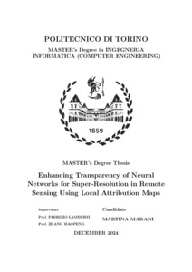 As deep learning models advance, their use in Super Resolution (SR) tasks has become pivotal for enhancing remote sensing low-resolution (LR) satellite images. However, the decision-making processes within these neural networks remain opaque, especially in remote sensing applications where model transparency is critical. This thesis focuses on applying Explainable Artificial Intelligence (XAI) techniques, particularly Local Attribution Maps (LAMs), to analyze and interpret the internal behavior of both general-purpose and remote sensing specific SR neural networks. General-purpose models like SRGAN, EDSR, ESRT, and HAT, although highly effective in SR tasks, were originally designed for broader image enhancement challenges. In contrast, HSENet and MEN are tailored for the unique complexities of remote sensing, such as varied textures and intricate scene features. By leveraging LAMs, this research highlights how different networks prioritize and process features such as edges, textures, and high-frequency details to generate super-resolved outputs. This attribution analysis provides a detailed understanding of which input regions contribute most to the resolution enhancement, offering new insights into model behavior and performance. The comparative study between general-purpose and remote sensing-specific networks outlines the strengths and limitations of each model in handling the diverse data present in remote sensing imagery. The findings contribute to the growing field of XAI by offering transparency into SR model operations, ensuring their trustworthy application in sensitive areas like, e.g., environmental monitoring, urban planning, and reconnaissance. |