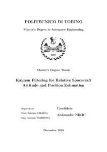 This thesis is framed within the context of the ESA Space Rider Observer Cube (SROC) mission. In this in-orbit servicing mission, a CubeSat is deployed from the Space Rider’s cargo bay to carry out a visual inspection of the vehicle, followed by a rendezvous and docking maneuver to return to the cargo bay. This work covers the development of an Extended Kalman Filter (EKF) to be implemented in the Navigation system of SROC for the phases of relative navigation (i.e under 1 km). The filter shall estimate the relative position, velocity, attitude and angular velocity between the Chaser and Target spacecraft. The accuracy of the position estimation is driven by the mission requirements, and is quantified as single-axis error of 0.4m in the range [40; 20] m, 0.2m in the range [20; 10] m, 0.1m in the range [10; 5] m and 0.02m in the range [5; 1] m. For the other estimates, an acceptability criterion in terms of absolute error is considered based on the estimated quantity (velocities and angles), e.g. the misalignment shall be less than 1 deg. The design of the filter is carried out by means of simulation, inside the framework of a Complete Flight Simulator developed on Matlab® \& Simulink® software. To achieve the Navigation task, first a camera model was developed to simulate the measurements done by SROC’s camera, expressed by a 12 × 1 vector containing a pair of 2D coordinates on the image plane for each of the 6 key points present on Space Rider’s body. The new state vector estimate is given by the Kalman filter that operates using this measurement, the state transition matrix and the measurement matrix. The simulation is carried out for a nominal case scenario and a worst case scenario in terms of measurement noise in order to assess the robustness of the solution. The results on relative position estimation comply with the requirements, for both study cases. The estimations of attitude and velocities are also satisfactory, while showing worst results for the noisier case study. Overall, the implementation of the EKF for relative position and attitude estimation is considered successful. |