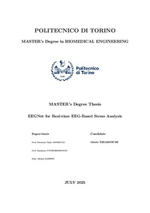Chronic stress is an increasingly critical issue for public health, but the current methods to detect it are often subjective, slow, or inadequate for a real-time application. This thesis proposes a system for the automatic analysis of mental stress based on electroencephalographic (EEG) signals, leveraging a convolutional neural network from the EEGNet architecture. The model was optimised to achieve high performance in terms of both accuracy and processing speed, to enable real-time integration in wearable and portable devices. The model has been trained on the public SAM40 dataset, and its hyperparameters were fine-tuned using K-fold cross-validation. To evaluate generalisation capabilities, the model was also tested on newly collected EEG data specifically acquired for this work. Results show a classification accuracy of 92.73% +- 2.08% when all sessions were included in the training set, and 67.65% +- 6.76% when only the first four sessions were used for training and the last session for testing. This indicates that including data from the target subject’s session significantly improves model performance. The inference speed of the complete pipeline, including data loading, data preprocessing, data preparation, and classification, was also evaluated. For each 2-second-long segment, the system required 252.7 ms +- 45.5 ms, corresponding to an Information Transfer Rate (ITR) of 16.62 bits/min. This latency is compatible with real-time applications. However, more than 70% of the processing time is currently consumed by the preprocessing step, which includes Independent Component Analysis (ICA) for artefact removal. Future work should aim to optimise the preprocessing pipeline to reduce computational load without compromising artefact removal quality. Additionally, although the current implementation operates offline on pre-recorded data, transitioning to an online, real-time system represents a key next step. Beyond stress detection, the proposed model has the potential to be adapted for the classification of other cognitive states, such as fatigue, distraction, or cognitive overload. When integrated into neurofeedback systems, it could enable real-time interventions for self-regulation and burnout prevention, paving the way for intelligent, adaptive tools for mental well-being. |