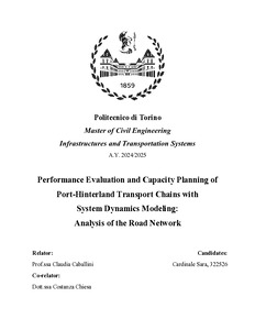 The efficiency of ports is greatly influenced by the interaction between the port’s internal road and rail networks. This thesis presents a System Dynamics simulation model, developed in Vensim PLE, with the goal of understanding these interdependencies, identifying critical bottlenecks, and analyzing the capacity of a port in Northern Italy to withstand disruptions and demand growth. The work will primarily describe the model related to the road traffic, and will subsequently analyze the intersections with the railway. The key findings demonstrate that these conflict points emerge as critical sources of inefficiency along with shared sections of the network, which lead to significant backpressure and a cascading delay that propagates throughout the whole network, causing congestion. This research presents itself as a strategic tool to evaluate the port’s resilience and to analyze its effectiveness under potential interventions at both an infrastructural and operational level. |