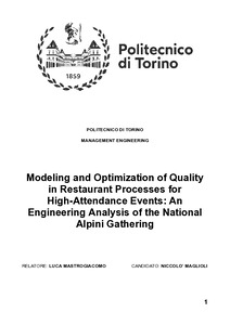 This master’s thesis investigates how small foodservice enterprises can assess their processes, reorganize and optimize them to maintain service quality during high-attendance events. The analysis is conducted through a practical case of an independent family owned restaurant in Biella, home for the next “2025 Alpini’s National Gathering”, providing context and reason for the study. Starting from a theoretical framework (temporary organization theory, lean capacity management, and risk governance) the study first maps current “as-is” operations in a restaurant, identifying critical bottlenecks in physical layout, kitchen-dining coordination, and service flow. Through quantitative process metrics (Little’s Law, Takt Time, RevPASH) and service-blueprint analyses (Chapters 1–2), the research highlights key constraints that affect the throughput during peak hours. A mixed-method empirical approach (Chapter 3) based on first brief interactions with 25 local restaurants in Vicenza, weighted selection criteria, and semi-structured interviews with five cases to gather both operational and business strategic information. Chapter 4 translates these insights into a lean-informed redesign, proposing a staged “quick wins” plan to boost capacity and be prepared and ready to face such an event. Chapter 5 applies a tailored probability-impact risk matrix to identify and anticipate risks prescribing preventive, detective, and reactive mitigation strategies. The chapter aims to craft a pragmatic enterprise risk management approach for micro–restaurants contexts. Finally, Chapter 6 quantifies the 2025 Alpini weekend’s impact: comparative analyses are carried out to better understand the impact of the event on the restaurant. Overall, the research aims to provide a way to help other small business entrepreneurs to better understand their own processes, assess them, provide a framework in which they could operate to reorganize them and restructure them to be able to face any kind of event creating a resilient operational systems capable of sustaining high service standards while safeguarding profitability and reputation. |