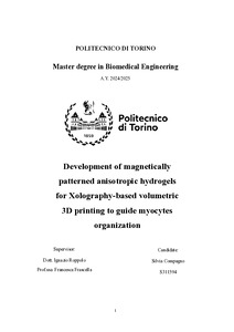 Skeletal muscle (SkM) is a highly organized tissue displaying multiple levels of structural organization, whose development and contractile function is intimately related to its anisotropic structure. To engineer SkM in vitro models, scaffolds must mimic the native extracellular matrix (ECM) architecture, providing not only bio-chemical but also physical cues to promote myoblasts alignment and maturation. Hydrogels provide a water-rich, biomimetic 3D environment, and represent the most promising candidate materials to engineer scaffold for tissue engineering applications. However, the intrinsic isotropy inherent to their network is not capable of guiding cell alignment, limiting their applicability to those tissues characterized by high level of structural anisotropy, like skeletal muscle. One of the latest strategies explored to produce anisotropic hydrogel scaffolds is based on the incorporation and remote manipulation of magnetic nanoparticles (MNPs) inside the hydrogel liquid precursor. Under a uniform magnetic field, they spontaneously arrange into linear, chain-like aggregates aligned along the field lines, which are finally stabilized upon ‘sol-to-gel’ transition of the host matrix. These anisotropic structures can act as topographical cues to guide cells alignment, as largely demonstrated in the literature. Super paramagnetic iron oxide particles (SPIOPs) are the most used type of MNPs due to their high cytocompatibility. Beyond structuration at the microscale, hydrogels can be fabricated into the required shape by a wide range of additive manufacturing (AM) technologies, including direct ink writing (bioplotting) and vat photopolymerization. The use of AM strategies has rapidly spread in the field of tissue engineering to address the growing need to improve the control over the structural and mechanical properties of scaffolds at the macroscale, key factors in regulating cells behavior. The integration of AM technologies with the self-assembly approach will pave the way for the fabrication of constructs with structural control at multiple scale lengths. Within this framework, the aim of the work is to investigate a further step ahead in the development of advanced hydrogels, studying a magnetically patterned, cell-laden, hydrogel-based scaffold which can be processed via the innovative technology of Xolographic volumetric printing. The intended goal is to provide the hydrogel-photoresin with an inner microstrucure composed of anisotropic fibril arrangements of self-assembled SPIONs while preserving its printability. The research activities were conducted both at Politecnico di Torino (MPMNT research group) and at TUE in Eindhoven (the Netherlands), in the Dias Castilho’s group. In this Thesis work, first the principles of skeletal muscle engineering will be introduced (chapter 1), followed by a description of magnetic hydrogels (chapter 2) and additive manufacturing (chapter 3). Then, the experimental part will be showed, first explaining materials and methods (chapter 4) applied in this work and then reporting experimental results (chapter 5). Finally, a conclusion chapter will summarize the results obtained, discussing future developments. |