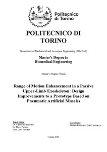 Industrial passive exoskeletons are used to assist workers in performing repetitive and physically demanding tasks, in fields such as manufacturing. These devices aim to reduce biomechanical stress on specific joint or anatomical regions, with the ultimate goal of reducing the risk of work-related musculoskeletal disorders. Among the various joints subjected to overwork, the shoulder joint presents a unique challenge due to its high degrees of freedom (DOF) and wide range of motion (ROM), which make it difficult to design support mechanisms that do not interfere with physiological movements. This thesis focuses on the biomechanical analysis and functional enhancement of a passive upper-limb exoskeleton prototype which employs two Pneumatic Artificial Muscles (PAMs). In its initial configuration, the exoskeleton provides assistive torque during arm elevation, but the current transmission architecture imposes limitations on the functional ROM, effectively constraining the shoulder flexion between 90° and 135°. This causes discomfort while using the engaged exoskeleton for elevation angles below 90°, due to the excessive torque at the shoulder joint provided by PAMs action. The main objective of this work is to extend the ROM of the passive exoskeleton, ensuring continuous or manually disengaged assistance, without compromising mechanical simplicity or user comfort. To achieve this, two distinct mechanical solutions have been developed and analyzed. The first solution involves the redesign of the bracelet, integrating a disengagement mechanism that allows the user to lower the arm with a simple gesture. This allows free movement of the arm down to a minimum angle of 26° with respect to the vertical axis. This adjustment does not alter the existing transmission architecture and preserves the advantages of the original prototype in terms of assistive torque. The second solution, based on a cam transmission system developed in the earlier stages of the prototypes design project, was analyzed in this thesis to evaluate its potential for torque modulation and integration into the exoskeleton because of its optimal ROM in terms of flexion. The cam profile has been designed to modulate the torque transfer from the PAMs as a function of the arm elevation angle. This solution has not been developed because of the complexity of the integration on the back structure and the poor supportive torque while holding an object. In order to evaluate the possibilities of the ROM expansion this solution has been optimized to be implemented in the current back-frame, evaluating the pros and cons of the solution. Both design strategies have been modeled using CAD and evaluated through static simulation. Performance indicators such as achievable ROM, integration with existing components, and theoretical torque profiles were compared. The cam-based mechanism was subjected to analysis regarding manufacturability and integration into the existing structure. The results demonstrate that both approaches effectively expand the exoskeleton’s functional ROM. The disengagement-based bracelet design allows the user to regain use of the lower workspace without adding complexity to the system and preserving the support torque while not disengaged, while the cam mechanism enables continuous support in the ROM but provides less support while having weight in the hands. A future work implementing passive adaptable springs in the current transmission design could be an aspect that preserves the pros of both solutions. |