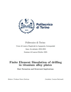 Burrs are unwanted material projections formed during machining processes, such as milling, drilling, turning, or grinding, that deviate from the ideal geometry of the workpiece. Their presence has long been recognized as detrimental for both structural integrity and manufacturing efficiency. On a mechanical level, burrs can reduce strength under static and fatigue loading, damage protective coatings, and generate subsurface defects or contamination. Functionally, they interfere with assembly by causing misalignments and increasing surface roughness, while from a production perspective they require costly, labor-intensive, and non-value-added deburring operations. Indeed, deburring may account for 5–30% of the total manufacturing cost, with significant implications for cycle time, manpower, and rejection rates, especially in the case of small and high-precision aerospace components. The aerospace industry is particularly affected by burr formation, since drilling represents one of its most common processes. A civil aircraft may require up to three million drilled holes, mainly for the mechanical fastening of aluminum, titanium, or hybrid stacks. Current standards demand that burr height remain below 100 μm, yet such precision is difficult to achieve without deburring. Traditionally, assembly involves intermediate steps of disassembly for cleaning and deburring, which add no value to the product. To overcome this limitation, the One Way Assembly (OWA) concept has been introduced: holes are drilled directly during assembly without subsequent separation. This method offers clear advantages in terms of cost reduction, lead time, automation, and production planning, and has been progressively adopted by leading manufacturers such as Boeing and Airbus. However, eliminating deburring raises critical challenges, particularly concerning burr-induced contamination and chip entrapment at the interface, which may compromise joint fatigue performance. Effective implementation of OWA therefore requires improved control of drilling parameters, precise clamping strategies to minimize inter-part gaps, and robust inspection and predictive assessment methods. The aim of this project, conducted in collaboration with ISAE-SUPAERO, is to develop a finite element model of the drilling process for titanium alloy Ti6Al4V. The model is designed to predict final hole geometry and simulate burr formation mechanisms, with a particular focus on evaluating their influence on fatigue strength. By extracting residual stresses from the simulated hole walls and implementing them in numerical tensile tests, the work provides new insights into the correlation between burr presence, residual stress distribution, and structural performance.