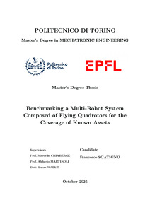 Benchmarking a Multi-Robot System Composed of Flying Quadrotors for the Coverage of Known Assets.