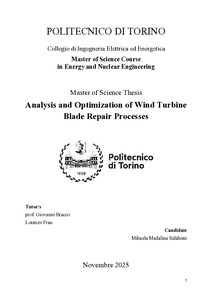 This thesis analyses and optimizes the repair processes of wind turbine blades, focusing on onshore maintenance and its impact on technical performance, cost reduction, and environmental sustainability. Wind energy is a key pillar of the energy transition, yet blade deterioration remains a major challenge for reliability and lifecycle efficiency. The study examines damage typologies, repair methods, and material choices to define a structured approach to blade restoration that combines engineering accuracy and sustainability metrics. Structural repairs—such as scarf joints, core replacements, and trailing-edge restorations—restore up to 95% of the original mechanical strength, provided that surface preparation, adhesive selection, and curing parameters are rigorously controlled. Surface repairs, including polyurethane coatings and erosion tapes, restore aerodynamic efficiency and limit performance losses due to environmental wear. The use of UV-curable and thermoplastic resin systems allows field curing in less than one hour, significantly reducing downtime, labour, and energy consumption. Field data confirm that curing and humidity deviations can reduce fatigue life by over 40%, highlighting the importance of process control and technician certification under ISO 45001 and GWO standards. Economically, optimized repair and predictive maintenance strategies reduce O&M costs by 15–25%. From an environmental standpoint, each repair avoids 8–10 tonnes of composite waste and 15–20 tonnes of CO2-equivalent emissions, representing a 90–95% impact reduction compared to full blade replacement. The thesis concludes that repairing rather than replacing is not only a maintenance choice but a strategic action for circular engineering. Through predictive analytics, advanced materials, and standardized repair procedures, wind farms can extend asset life, reduce emissions, and enhance long-term competitiveness—transforming blade repair into a core enabler of a sustainable and decarbonized energy future. |