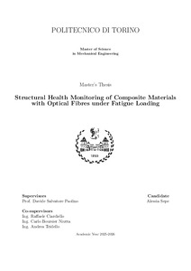 Structural Health Monitoring (SHM) is a growing ensemble of techniques devoted to collect and analyse data from structures in order to detect early damage, thus allowing to continuously evaluate their integrity and performance. The use of Structural Health Monitoring (SHM) is particularly challenging for composite materials due to their heterogeneous nature. The anisotropic behaviour, complex damage mechanisms, and poor visual detectability of internal defects make traditional inspection methods less effective. Among others, Distributed Fibre Optic Sensors (DFOS) represent a promising technique, ensuring full-field strain measurements with high resolution and real-time monitoring capability. In this context, the present work investigates an innovative hybrid optical fibre designed to optimize both sensing accuracy and installation robustness. The hybrid configuration consists of alternating sections of fibres with acrylate and polyimide coatings. The central polyimide segment, which is responsible for high strain-transfer accuracy, is embedded within the composite laminate, while the acrylate-coated portions are welded to the polyimide-coated ones and positioned at the composite exit region, thereby improving handling and reducing the risk of unexpected breakage thanks to the greater flexibility of the acrylate. To experimentally validate this design, carbon/epoxy composite specimens were manufactured using twill woven pre-pregs, with the hybrid optical fibre embedded along the longitudinal axis. Tensile tests were performed to evaluate the ability of the embedded polyimide section to accurately record mechanical strain through DFOS based on the Rayleigh backscattering principle, using the Luna ODiSI 6100 system as an interrogator. The results confirmed that the polyimide-coated region effectively captured the local strain field, enabling the determination of the elastic modulus in agreement with values previously reported for specimens instrumented with fully polyimide-coated fibres. Subsequently, a fatigue testing campaign (tension-tension mode) was carried out to further assess the measurement capability of the DFOS under cyclic loading. The fatigue behaviour of specimens with embedded DFOS and specimens without sensors was compared to evaluate the influence of the embedded DFOS in carbon composite laminates. |