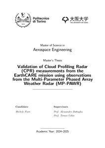 This thesis analyses the reflectivity measurements acquired by the Cloud Profiling Radar (CPR) onboard the EarthCARE satellite, operated by the European Space Agency (ESA) in collaboration with the Japan Aerospace Exploration Agency (JAXA), and those provided by the Multi-Parameter Phased Array Weather Radar (MP-PAWR), located in the Osaka region, Japan. The main objective is to quantitatively evaluate the level of agreement between the two data sources, identifying the main sources of discrepancy due to instrumental, geometric, and physical factors, and to assess the ability of the phased array radar to accurately represent the vertical structure of clouds and precipitation compared to a spaceborne reference system. In the first phase, a detailed technical study of the operational characteristics of both radar systems was carried out, with particular attention to the minimum detectable sensitivity of the MP-PAWR. This analysis allowed determining the detectability threshold of reflectivity as a function of distance, atmospheric attenuation, and the receiver system specifications. In parallel, algorithms were developed for the visualization, processing, and comparison of EarthCARE and MP-PAWR radar data, including procedures to identify satellite overpasses above the ground-based radar scanning volume, determined through an accurate analysis of the ground track repeat cycle. To ensure geometric consistency between the two datasets, MP-PAWR data were transformed into the same reference system as the CPR, including correction for Earth's curvature. After verifying the spatio-temporal correspondence, the effective intersection volume was selected, and a direct comparison of reflectivity measurements was conducted. For validation purposes, a volumetric matching approach based on the method of Schwaller and Morris was implemented, taking into account both spatial proximity and the similarity of radar reflectivity values between points in the two datasets. The mean bias, Root Mean Square Error (RMSE), and Pearson correlation coefficient were calculated, accompanied by graphical representations including scatter plots and latitude–altitude cross-sections. Analysis of multiple case studies revealed that, despite spatial and temporal consistency between observations, the reflectivity measured by MP-PAWR differs significantly from that of the CPR. This discrepancy is partly attributable to the operating frequency difference between the two instruments: the CPR operates at 94 GHz (W-band), sensitive to ice particles and small droplets, while the MP-PAWR operates at 9.71 GHz (X-band), more suited to detecting larger hydrometeors. This spectral divergence induces variations in scattering response, amplified by non-Rayleigh scattering effects, signal attenuation, and the application of the Moving Target Indication (MTI) filter in the phased array system. Overall, the results indicate that the MP-PAWR cannot be considered a direct validation tool for EarthCARE CPR observations, due to the physical and operational differences between the two systems. However, this work highlights the importance of the phased array radar as an experimental platform for algorithm testing and the development of methodologies for comparing spaceborne and ground-based radar observations. |