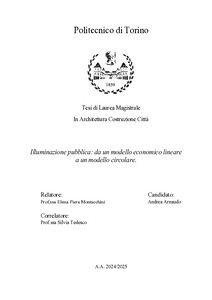 Il presente lavoro ha l’obiettivo di analizzare l’applicazione dei principi dell’Economia Circolare nel settore dell’illuminazione pubblica a livello nazionale. Dopo una breve introduzione volta a chiarire cosa sia l’illuminazione pubblica e come venga gestita in Italia, il secondo capitolo è dedicato all’esposizione dei principali concetti di Economia Circolare, sia in termini generali che adattati specificamente al contesto dell’illuminazione pubblica, ambito di analisi della tesi. Il terzo capitolo si concentra sul quadro normativo di riferimento, con particolare attenzione ai Criteri Ambientali Minimi (CAM) e alle Dichiarazioni Ambientali di Prodotto (EPD). Tali strumenti forniscono indicazioni rilevanti per la progettazione in ottica circolare e costituiscono un importante riferimento per i professionisti del settore. Nel capitolo riguardante i casi studio si vuole evidenziare e analizzare lo stato dell’arte dell’economia circolare per quanto riguarda i progetti di illuminazione pubblica, mettendo in mostra gli aspetti positivi e le eventuali mancanze. Vengono inseriti due casi studio in ambito Nazionale, progetti di riqualificazione urbana, e due Olandesi, gare pubbliche per l’aggiudicazione degli appalti per l’illuminazione. Infine, viene presentato il caso studio di una guida pubblicata per fornire indicazioni e suggerimenti al fine di migliorare la circolarità dell’illuminazione pubblica olandese. L’ultimo capitolo è dedicato alla presentazione di una proposta personale: una guida per l’applicazione dell’economia circolare all’illuminazione pubblica italiana. La guida si articola in una serie di proposte operative finalizzate a incrementare la circolarità degli impianti in tutte le fasi del loro ciclo di vita, dalla progettazione, alla gestione e manutenzione, fino alla dismissione. Il tema centrale della tesi riguarda quindi l’applicazione dei principi dell’economia circolare al settore dell’illuminazione pubblica in Italia, con un focus principale sugli aspetti legati ai componenti degli impianti e ai materiali impiegati per la loro realizzazione. |