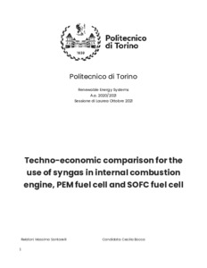 Techno-economic comparison for the use of syngas in internal combustion engine, PEM fuel cell and SOFC fuel cell.