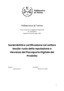 Sostenibilità e certificazione nel settore tessile: ruolo della reputazione e rilevanza del Passaporto Digitale del Prodotto = Sustainability and certification in the textile industry: role of reputation and relevance of the Digital Product Passport.