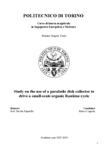 Study on the use of a parabolic dish collector to drive a small-scale organic Rankine cycle.