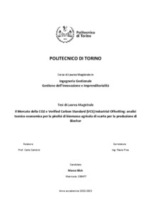 Il Mercato della CO2 e Verified Carbon Standard (VCS) Industrial Offsetting: analisi tecnico-economica per la pirolisi di biomassa agricola di scarto per la produzione di Biochar = The CO2 Market and Verified Carbon Standard (VCS) Industrial Offsetting: a techno-economic feasibility study for the pyrolysis of agricultural waste biomass to product Biochar.