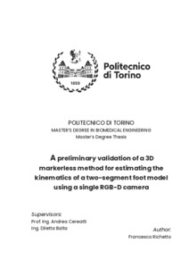 A preliminary validation of a 3D markerless method for estimating the kinematics of a two-segment foot model using a single RGB-D camera.