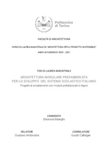 ARCHITETTURA MODULARE PREFABBRICATA PER LO SVILUPPO DEL SISTEMA SCOLASTICO ITALIANO. Progetto di ampliamenti con moduli prefabbricati in legno = Modular prefabricated architecture for the development of the Italian educational system. Projects of schools' extensions with timber prefabricated modules.