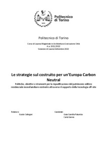 LE STRATEGIE SUL COSTRUITO PER UN’EUROPA CARBON NEUTRAL Politiche, obiettivi e strumenti per la riqualificazione del patrimonio edilizio residenziale monofamiliare esistente attraverso il supporto della tecnologia off-site = BUILDING STRATEGIES FOR A CARBON NEUTRAL EUROPE Policies, objectives and tools for the retrofitting of the existing single-family residential building stock through the support of the off-site strategies.
