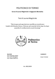 Electrospun polycaprolactone nanofibrous membranes loaded with Manuka Honey, Chitosan and essential oils by layer-by-layer assembly for antibacterial wound dressings.