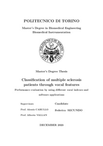 Classification of multiple sclerosis patients through vocal features - Performance evaluation by using different vocal indexes and software applications.