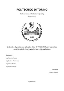 Combustion diagnostics and calibration of the GT POWER "DI-Pulse" heat release model for a 11.0L diesel engine for heavy-duty applications.