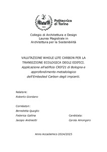 VALUTAZIONE WHOLE LIFE CARBON PER LA TRANSIZIONE ECOLOGICA DEGLI EDIFICI. Applicazione all'edificio CRIF21 di Bologna e approfondimento metodologico dell'Embodied Carbon degli impianti = WHOLE LIFE CARBON ASSESSMENT FOR THE ECOLOGICAL TRANSITION OF BUILDINGS. Application to the CRIF21 Building in Bologna and Methodological Deepening of the Embodied Carbon of MEP Systems.
