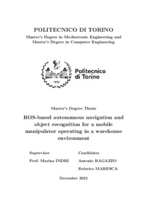 ROS-based autonomous navigation and object recognition for a mobile manipulator operating in a warehouse environment.