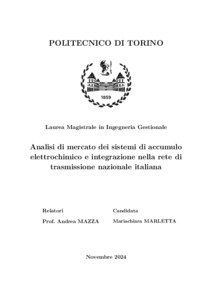 Analisi di mercato dei sistemi di accumulo elettrochimico e integrazione nella rete di trasmissione nazionale italiana = Market Analysis of Electrochemical Storage Systems and Integration into the Italian National Transmission Grid.
