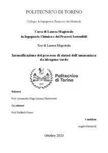 Intensificazione del processo di sintesi dell’ammoniaca da idrogeno verde = Process intensification of ammonia process from green hydrogen.