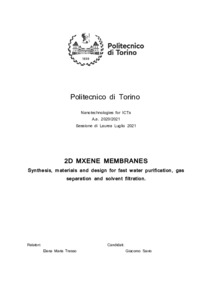 Membrane 2D al MXene: sintesi, materiali e design per purificazione dell'acqua, separazione dei gas e filtrazione solventi = 2D MXene Membranes: synthesis, materials and design for fast water purification, gas separation and solvent filtration.