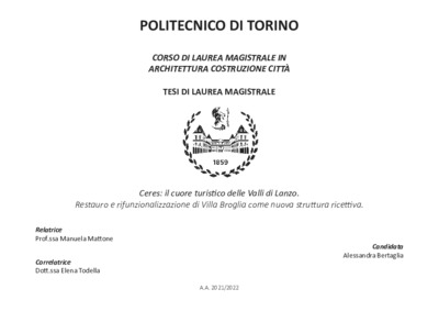 Ceres: il cuore turistico delle Valli di Lanzo. Restauro e rifunzionalizzazione di Villa Broglia come nuova struttura ricettiva = Ceres: the tourist heart of the Lanzo’s Valleys. Restoration and re-functionalization of Villa Broglia as a new accommodation facility.